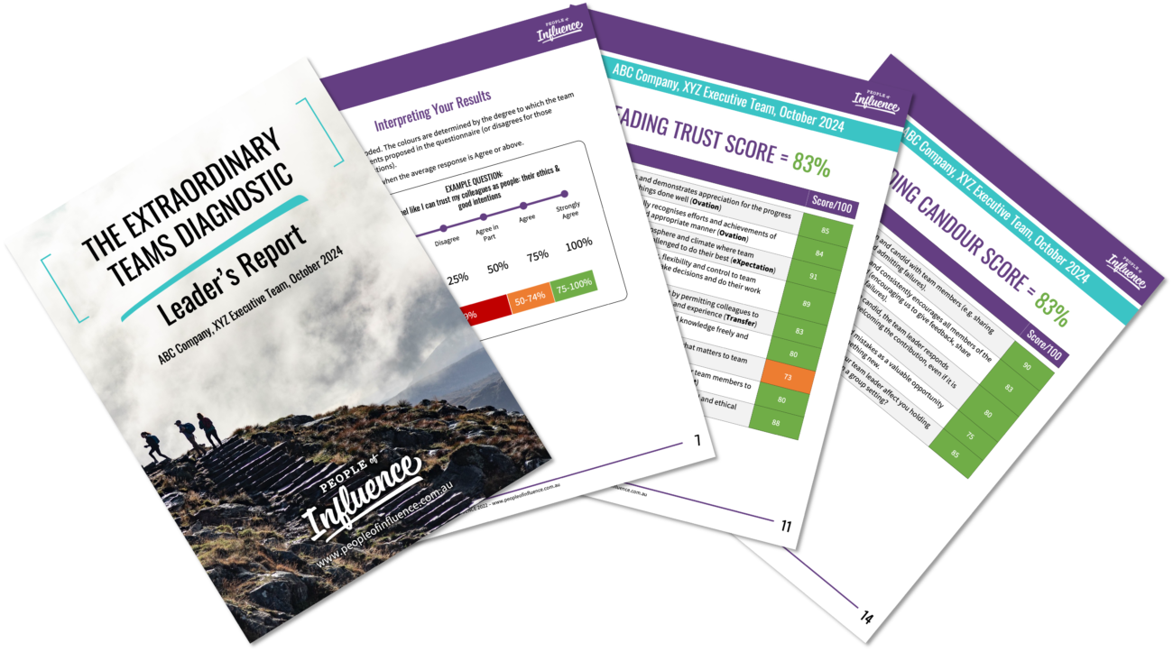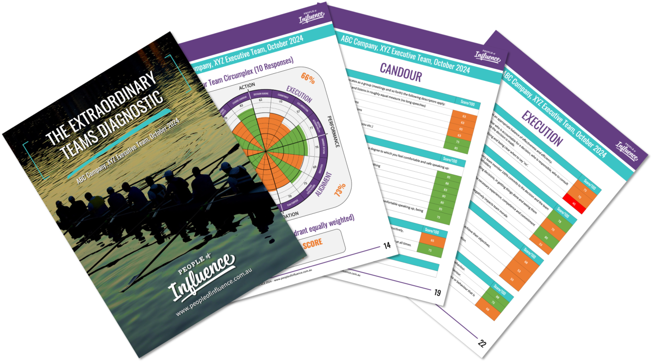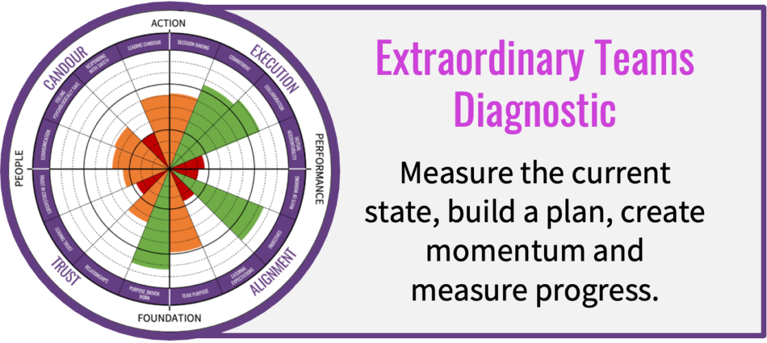 The Extraordinary Teams Diagnostic is like a 360º on the team itself by every member of the team (including the leader). We developed this tool to remove the guess work out of diagnosing and prescribing team interventions and for measuring progress. We use this tool to great effect with executive teams, leadership teams and functional teams across a wide variety of industries.